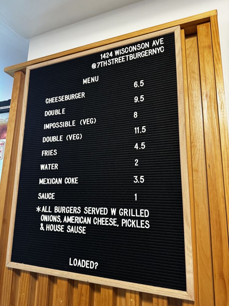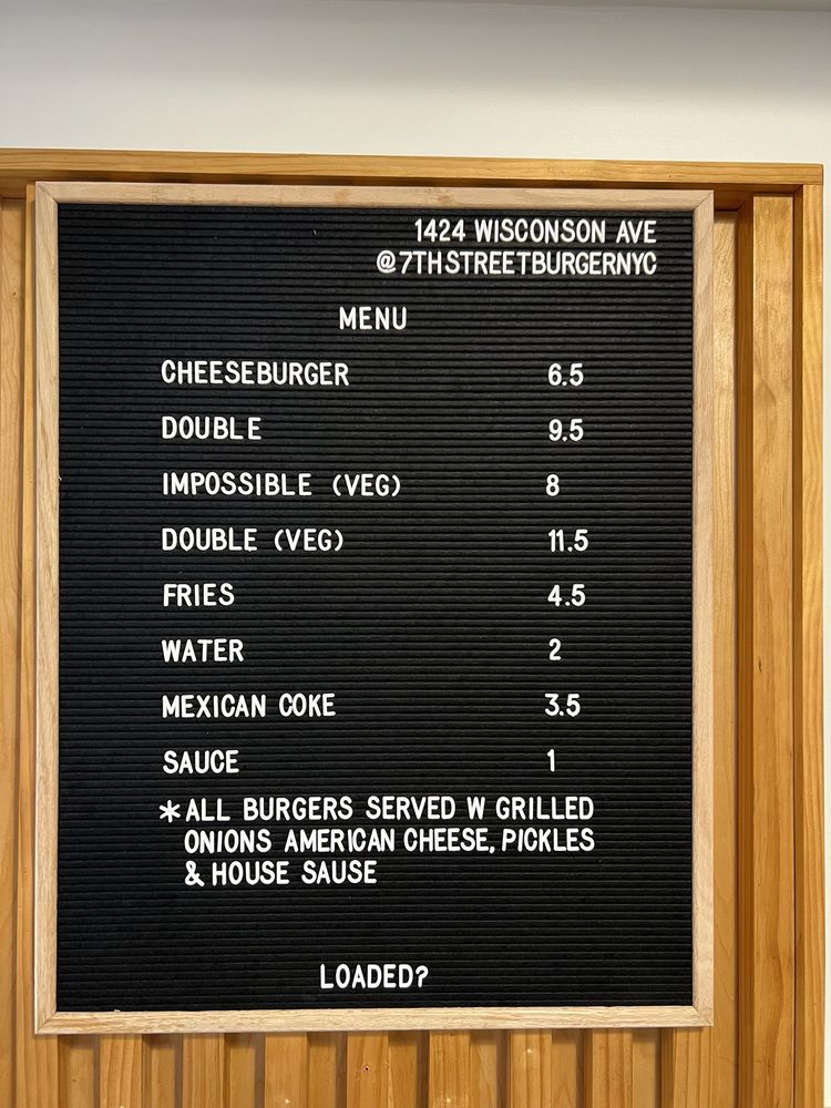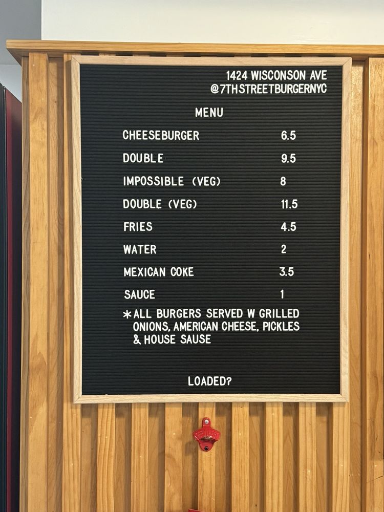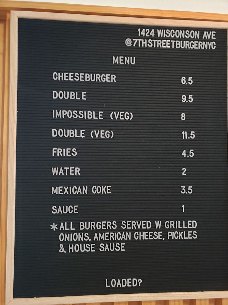 Introducing the menu at 7th Street Burger, a burger joint in Georgetown, Washington, D.C., known for its delicious smash burgers. The menu features classic options like the Cheeseburger with a single patty, American cheese, grilled onions, pickles, and house sauce on a Martin's potato bun, as well as the Double Cheeseburger for a heartier option. Vegetarians can enjoy the Impossible Burger with all the same toppings. Sides include fries, loaded with beef or Impossible burger toppings, and a savory house sauce. Customers rave about the warm, cheesy burgers and friendly service, making 7th Street Burger a must-visit for burger enthusiasts. Don't miss out on their limited-time offer of a free graphic tee with every three burger purchase.